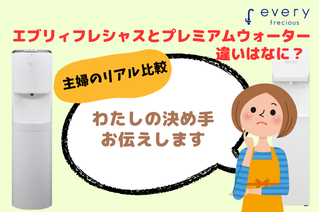 いちばん大きな違いは、エブリィフレシャスは浄水型、プレミアムウォーターは天然水の宅配型というところです。