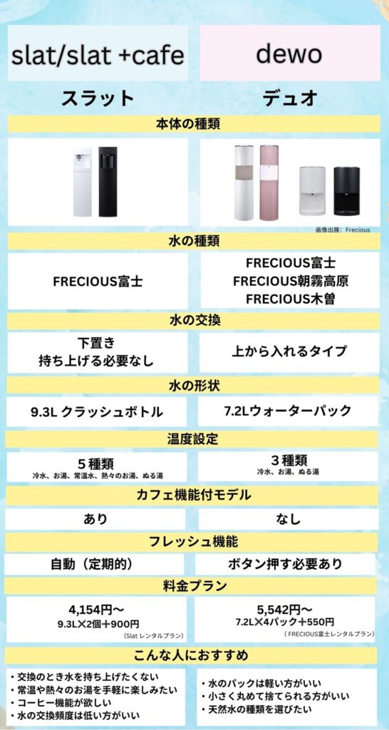 ちなみに私が10年前に初めて使ったのが『dewo』で、今は『Slat』に乗り換えています。『Slat』は重たいボトルを持ち上げる必要がなく、とにかく楽ちん!腰に優しい設計が嬉しいポイントです。ボトルが9.3Lなのでdewoよりも水の交換頻度が低くて済むようになりました